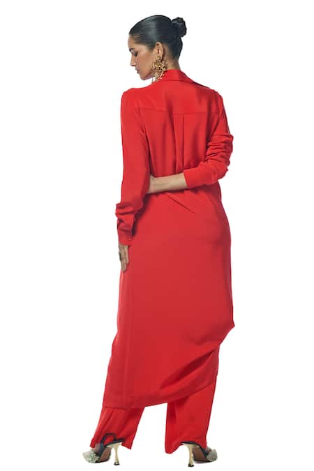 Red silk shirt jacket featuring full sleeves, collar neckline, and asymmetric buttoned panel. Paired with matching trousers for a cohesive look.