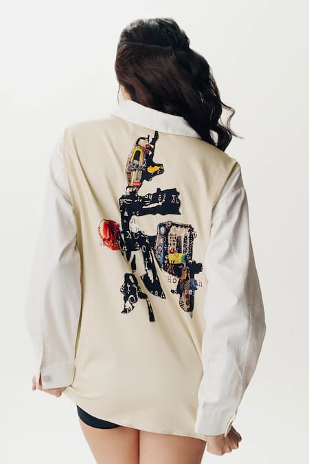 Cream Cotton Embroidery Collared Slogan Print Shacket
