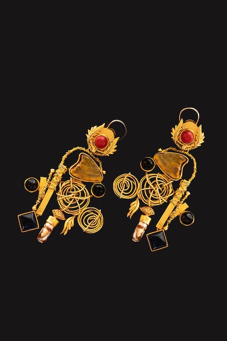 Gold toned earrings featuring carved motifs and twisted cords