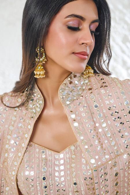 Pink embroidered cape featuring zari and patra work with a high collar. Paired with a matching bustier and pant.