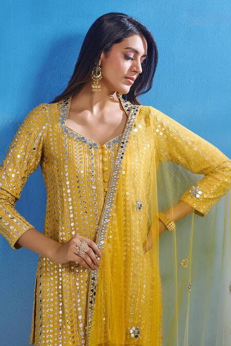 Yellow kurta featuring zari and patra embroidery, paired with a chevron pattern sharara and a matching dupatta. The set includes attached lining for comfort.