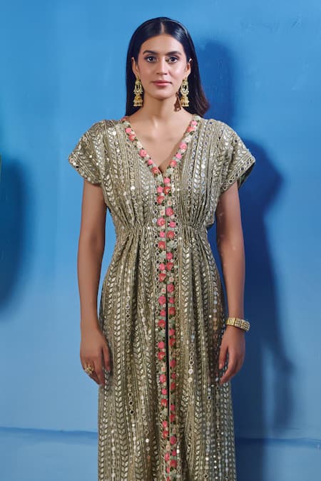 Green kaftan featuring floral embroidery with zari and patra work. Paired with matching pant in a relaxed fit.