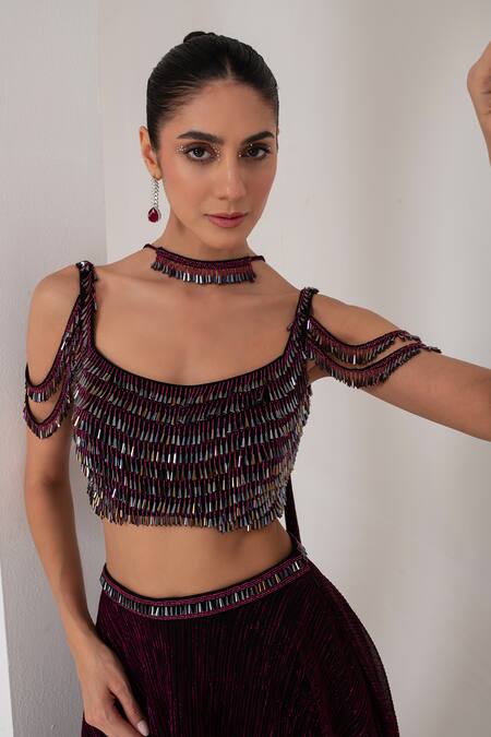 Black lehenga featuring all-over metallic brazen fall detailing and a pink crystal embroidered waistband. Paired with a cold shoulder blouse embellished with halo crystal tassels and a choker style dupatta.