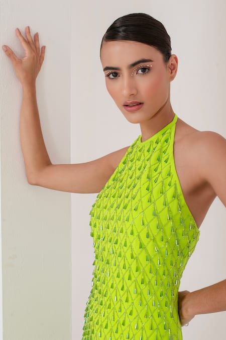 Neon green halter neck dress featuring tonal crystal tassel embellishments