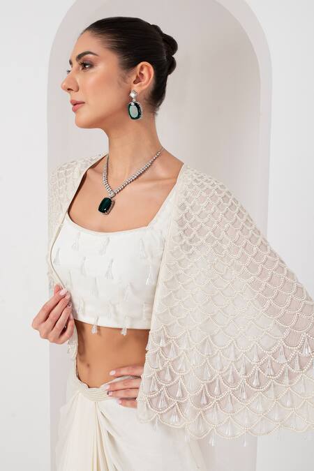 Ivory Georgette Pearls, Beads Divine Scallop Embellished Cape Draped Skirt Set
