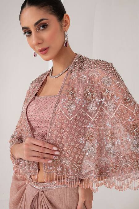 Pastel pink blouse featuring a square neckline and sequin jaal embellishments. Paired with a draped skirt and a pastel pink cape adorned with florence embroidery, crystal tassels, and cutdana work.