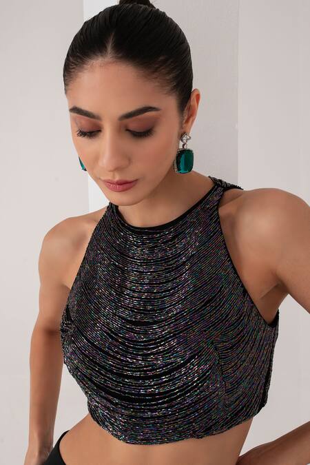 Black halter neck blouse featuring all-over halo nalki chain embellishments. Paired with a solid high-low lehenga with attached lining and cancan.