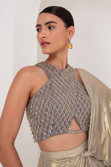 Metallic grey and gold pre-draped saree made from metallic georgette. Accompanied by a sleeveless halter neck blouse featuring tonal crystal tassel and cutdana embellishments.