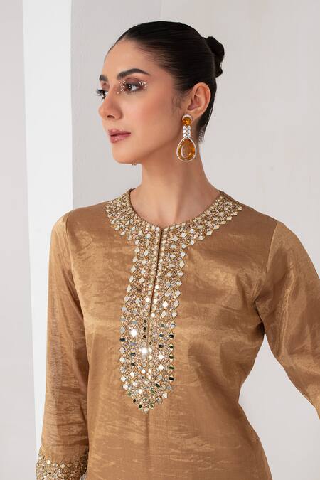 Gold Tissue Embroidery, Mirrors Round Neck Placement Kurta Set