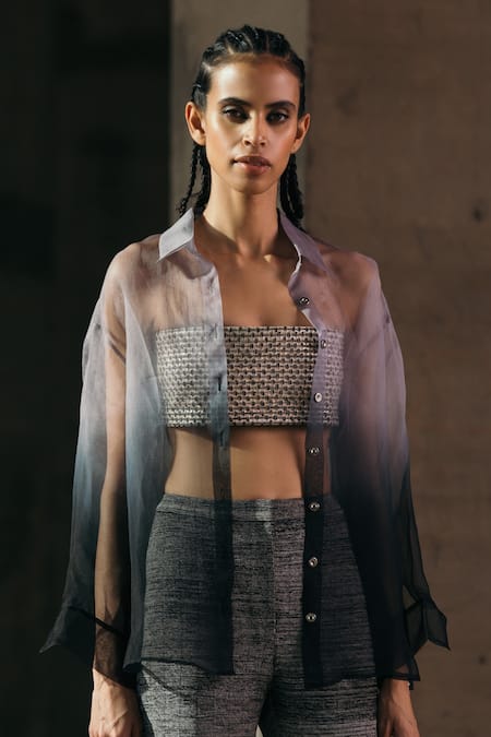 Grey Silk Organza Shawl Neck Gradient Sheer Shirt