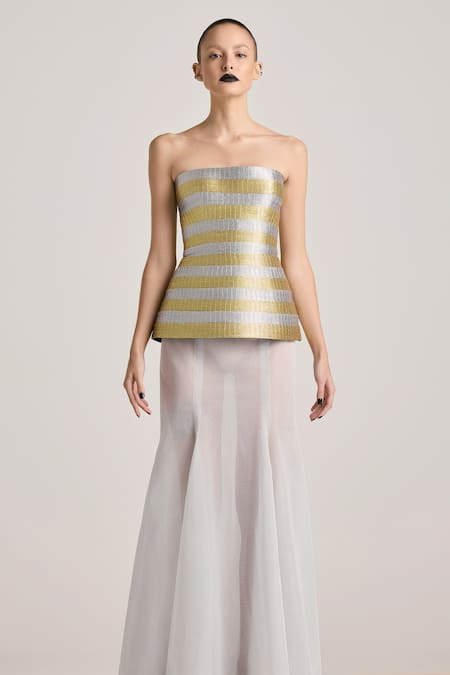 Gold and silver padded corset featuring hand embroidered metallic yarn tapes. Paired with a fishtail skirt made from lurex tulle.