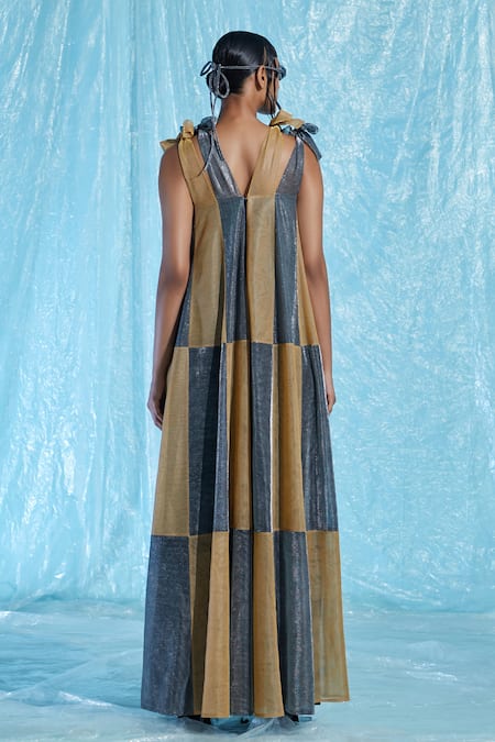 Multi-colored metallic maxi gown with an offset color blocked pattern and bows at shoulder.