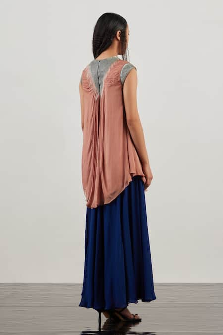 Glass yarn embroidered yoke, Fringed yoke detail, Contrast pleated layers