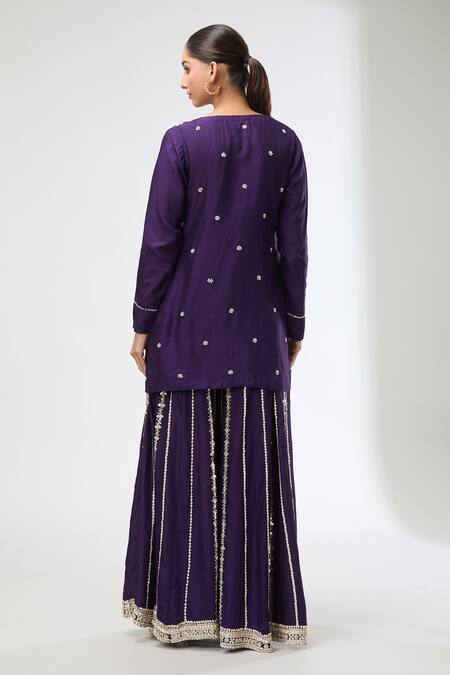 Purple kurta featuring hand embroidery with a V-neckline and long sleeves. Paired with a matching sharara and an organza dupatta.