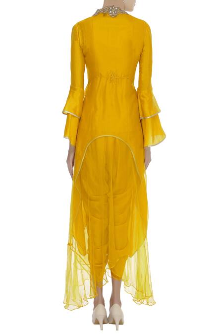 Yellow Silk, Organza Embroidered Shirt Bell Sleeves Kurta Dhoti Set With Jacket