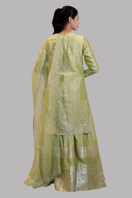Green Chanderi kurta with floral embroidered motifs. Comes with gota patti lehenga & dupatta.