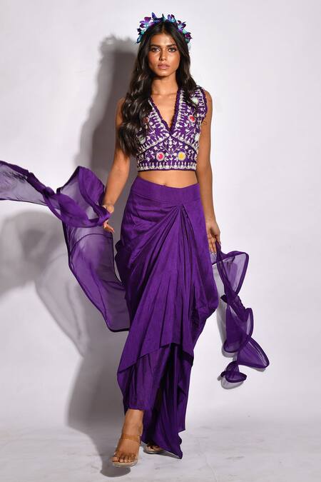 Buy_Aksh_Purple Taffeta, Art Organza, Bamber Silk Embroidered Crop Top And Draped Skirt Set_Online_at_Aza_Fashions