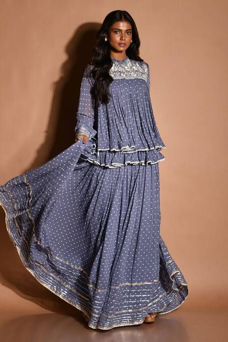 Buy_Aksh_Grey Georgette, Taffeta Floral, Geometric Round Print Kurta Sharara Set_at_Aza_Fashions