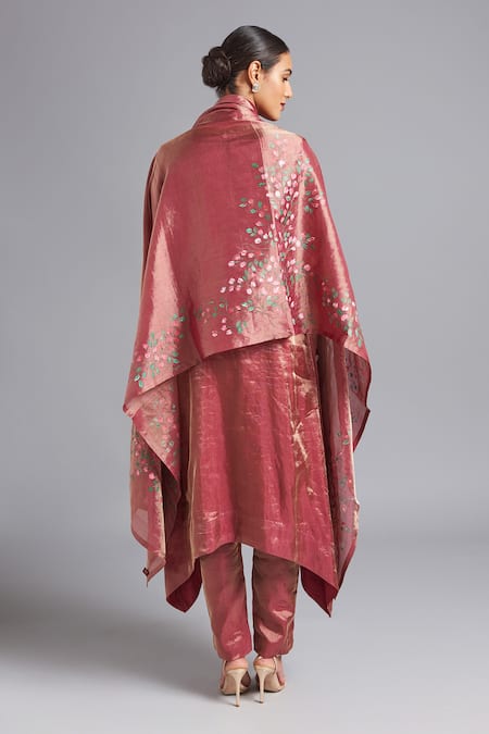 Pink Tissue Round Neck Ekantika Floral Pattern Asymmetrical Kurta And Pant Set