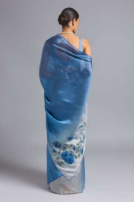 Blue and grey ombre silk organza saree featuring floral hand painting and sequin embroidery. Comes with a coordinating unstitched blouse piece.