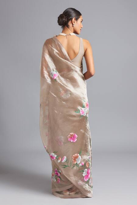 Grey tissue saree featuring floral hand-painted motifs and ditsy sequin embroidery. Comes with a coordinating unstitched blouse piece.
