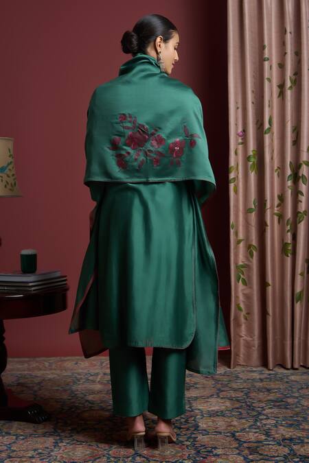 Green straight kurta featuring a floral handpainted design. Paired with a matching pant and handpainted dupatta.