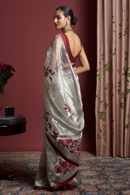 Silver handwoven saree featuring red floral hand-painted motifs and chanderi border detailing. Comes with a coordinating unstitched blouse piece.