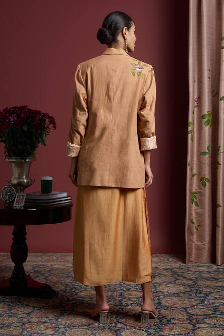 Peach blazer crafted from handloom cotton linen featuring a floral handpainted design