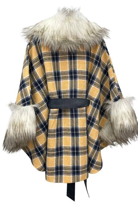 Yellow and blue plaid cape featuring fur lined detailing