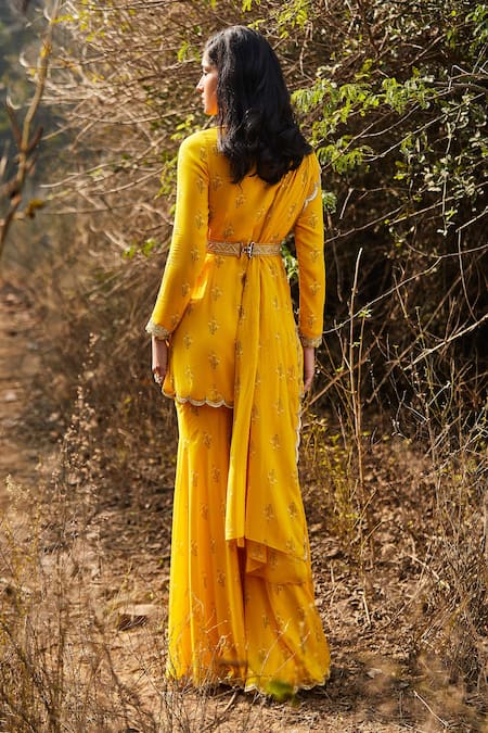 Yellow short kurta with all-over lilly motif print & placement hand embroidered sequin-zari work. Comes with gharara pants, embellished dupatta & scallop dupatta.