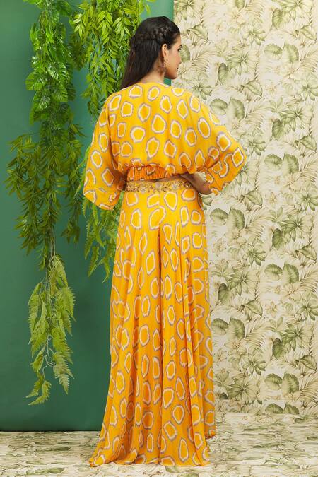 Yellow top with abstract print & sequin embroidery in floral pattern. Paired with palazzo.