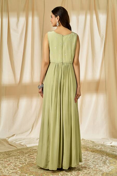 Green chevron embroidered anarkali featuring a V neck and sleeveless design. Paired with a matching palazzo and sheer dupatta.