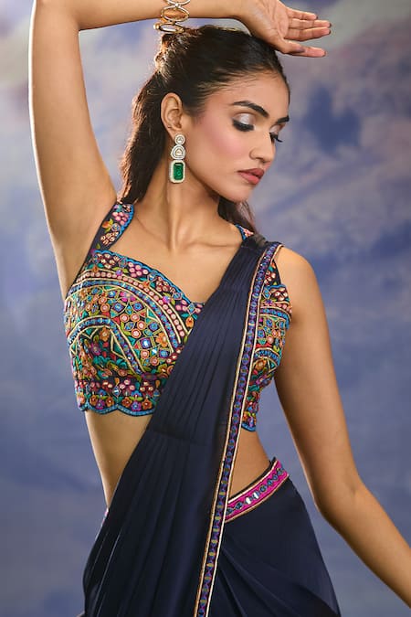 Navy blue pre-draped saree featuring a mirror embroidered border. Paired with a padded floral blouse adorned with thread and mirror work, showcasing scallop borders.