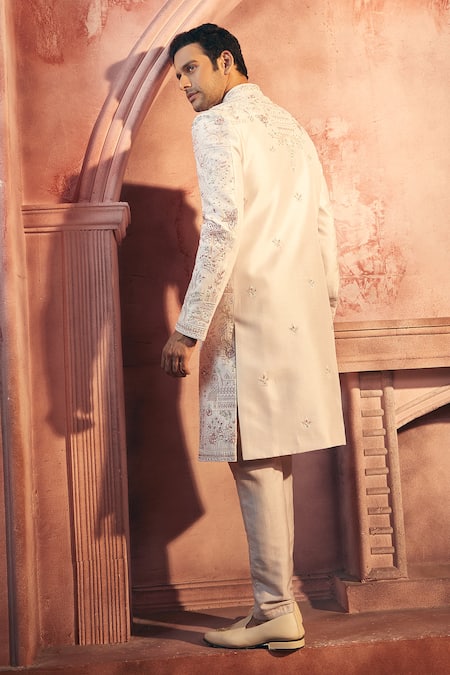 Floral thread and cutdana embroidery throughout the sherwani.