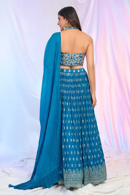 Peacock blue lehenga featuring micro pleats, floral patterns & paisley border. Paired with a floral embroidered padded halter neck blouse and a frill dupatta.