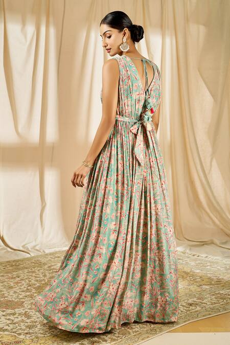 Ice blue floral print gown featuring a deep V neckline and sleeveless design. Paired with a net dupatta with a printed border.