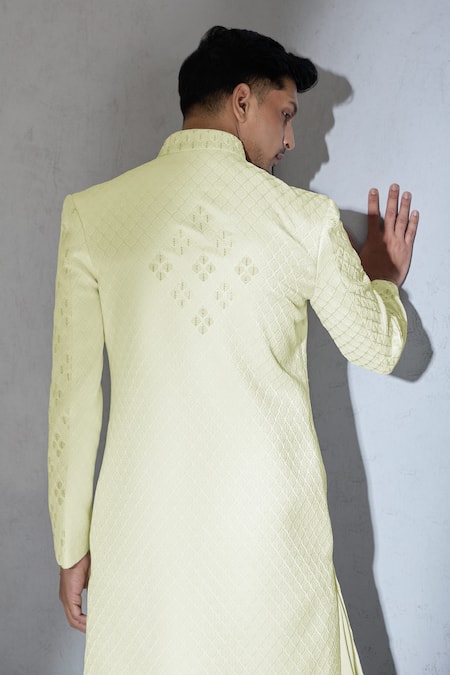 Geometric leaf thread embroidery all over the sherwani.