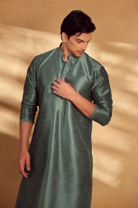 Green bandi featuring geometric print, paired with a solid kurta and pant. The bundi and kurta are made from a silk blend fabric, while the pant is crafted from poly silk.