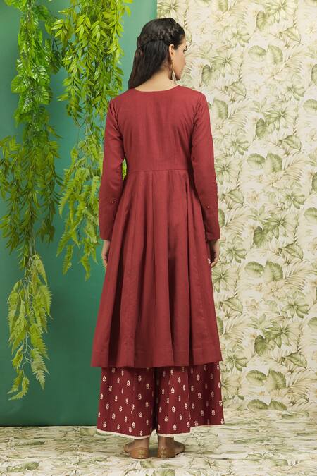 Red Cotton Embroidery, Mirrors V-neck Side Slit Kurta Palazzo Set