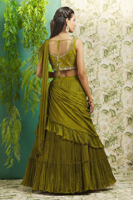 Mehendi green lehenga saree featuring a tiered flare with ruffle bordered pallu. Paired with a sweetheart neck padded blouse adorned with leaf pattern sequin, thread, zari, stone & pearl hand embroidery.