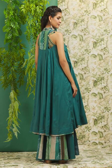 Rama green A-line kurta featuring floral embroidery on the yoke and multi braided straps at the back. Paired with panelled floral print flared pant.