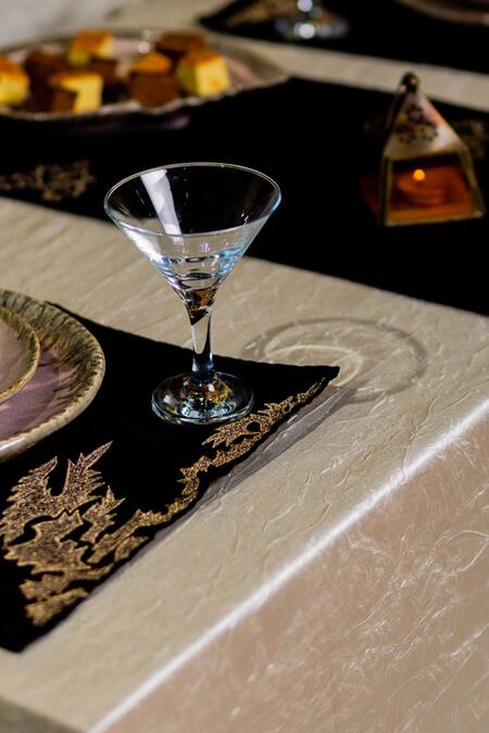 Black table runner with geometric embroidery. Comes with 6 piece table mats.