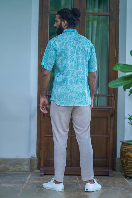 Aqua blue shirt featuring a collar neckline and half sleeves with an all-over conch shells print