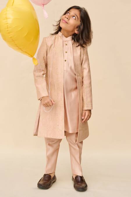 Blush pink achkan featuring zari embroidery, paired with a coordinating kurta and pyjama. The outfit includes an attached cotton lining for added comfort.