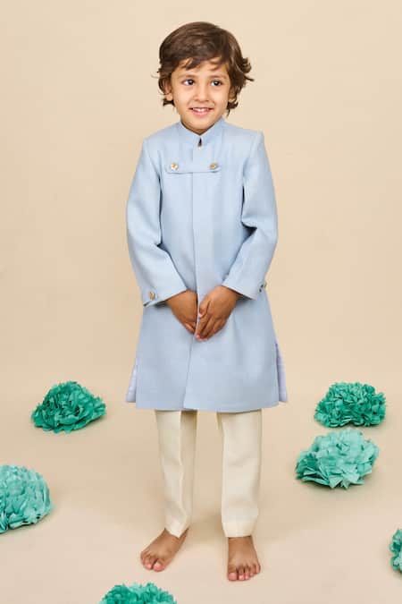 Sky blue achkan featuring thread and sequins embroidered buttons. Paired with a straight pyjama in a matching hue.