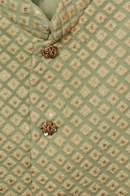 Green kurta set featuring a geometric motif jacket with sequins and thread work. Paired with a solid cotton silk kurta and pyjama.