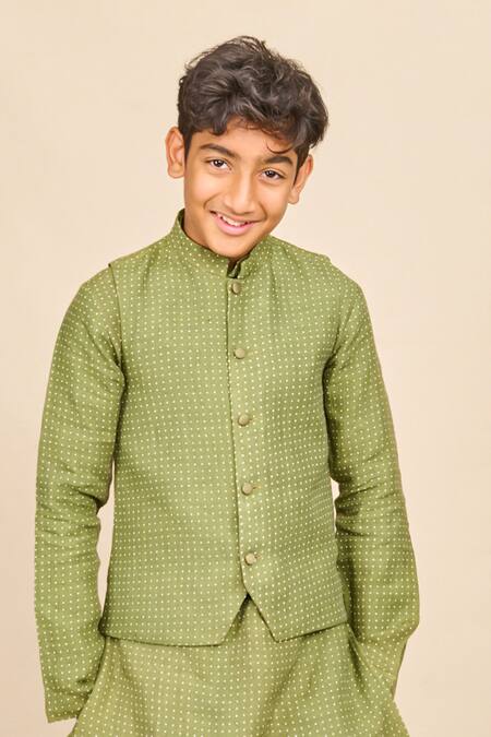 Buy_All Boy Couture_Green Chanderi, Linen, Handloom Cotton Polka Dot Print Bundi And Kurta Set_Online_at_Aza_Fashions