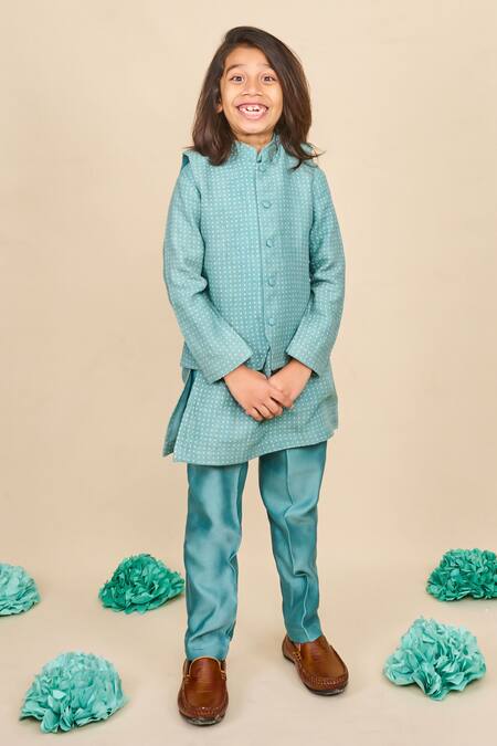 Blue polka dot print bundi featuring a band collar and front button closure. Paired with a coordinating full sleeve kurta and straight pyjama.