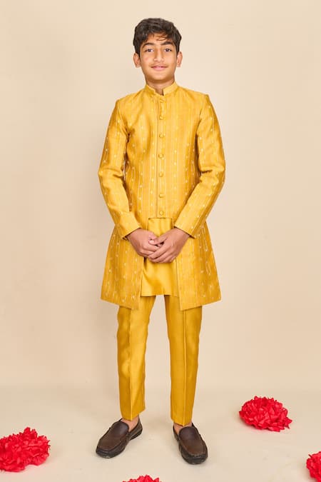 Honey yellow achkan featuring zari stripe woven motifs and a band collared neckline. Paired with a coordinating kurta and pyjama.