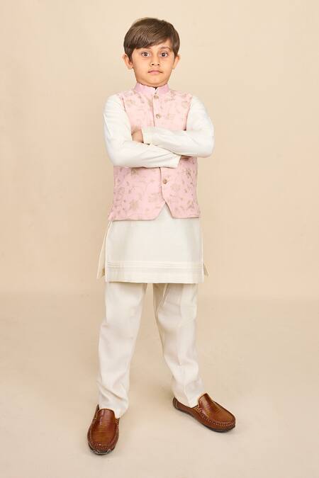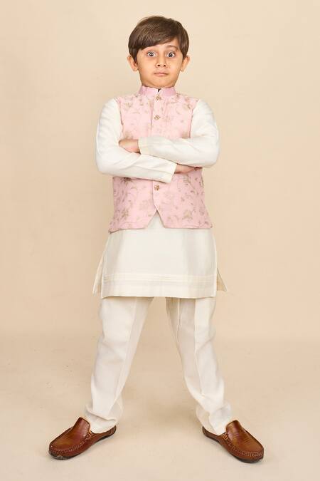 Baby pink bundi jacket featuring zari thread embroidery in floral pattern and a band collar. Paired with an off-white kurta and matching pyjama.